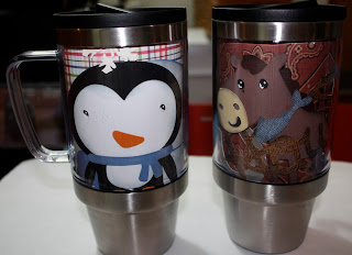 These are inserts for stainless steel mugs I purchased at WalMart photo department. I cut the characters with Create A Critter and used scraps I had on hand. They are gifts for my boys who like to take hot chocolate or tea in the car.